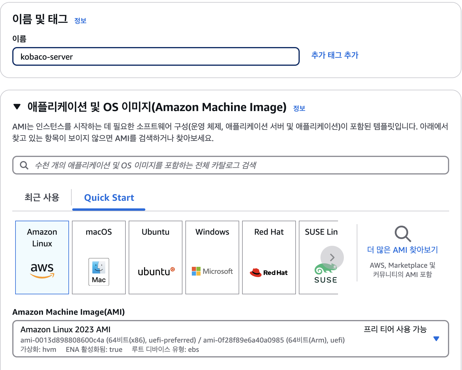 2. 이름 및 태그 입력, amazon Linux ami 선택