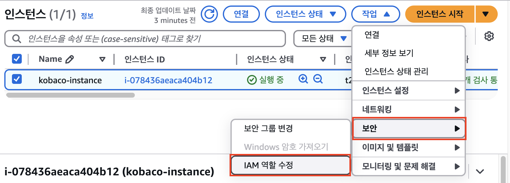 1. 작업 -> 보안 -> iam 역할 수정