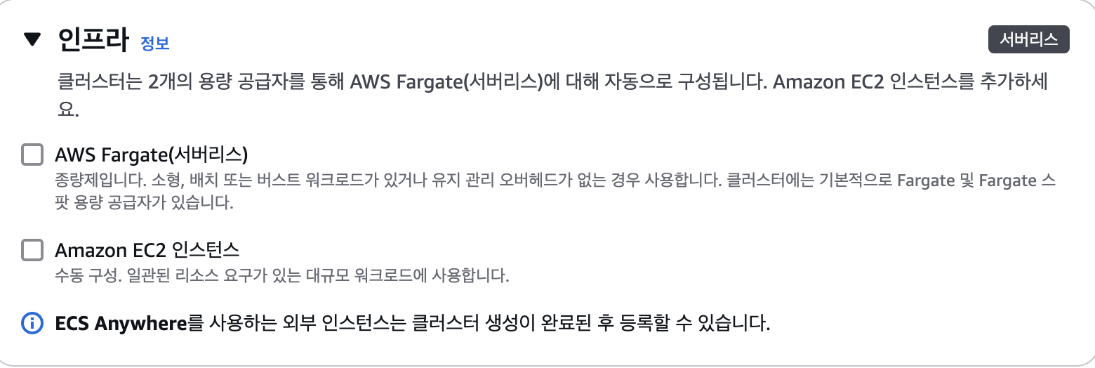 3. 기존 EC2에 직접 등록할 것이므로 → "AWS Fargate 및 EC2 선택 옵션 해제"
