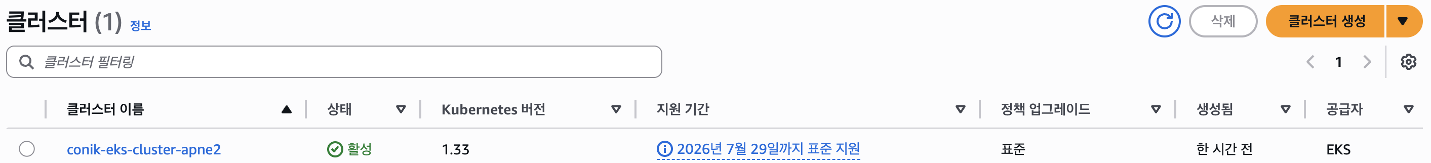 클러스터는 생성된는데 5-10분 사이로 걸리는 것 같다 생성이 완료되면, 상태값이 활성 상태로 바뀌고 클릭해서 세부 정보를 확인 가능하다.