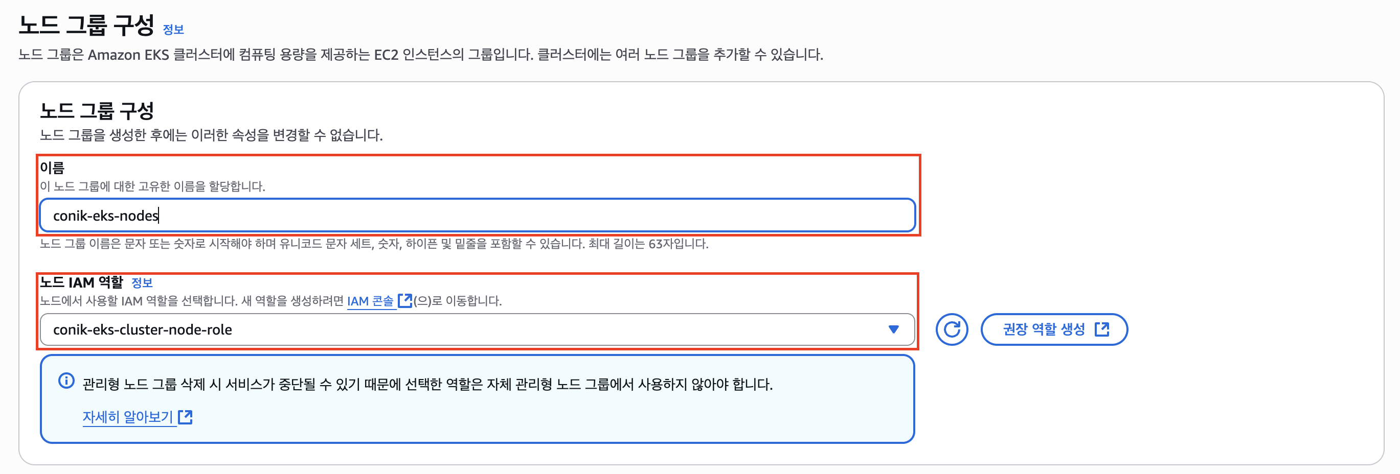 노드의 이름을 지정하고, 2번 단계에서 만들어둔 노드를 위한 역할을 할당한다. 여기도 마찬가지로 만들지 못하고 왔다면, 권장 역할 생성을 통해 생성하고 새로고침하여 할당하면 된다.