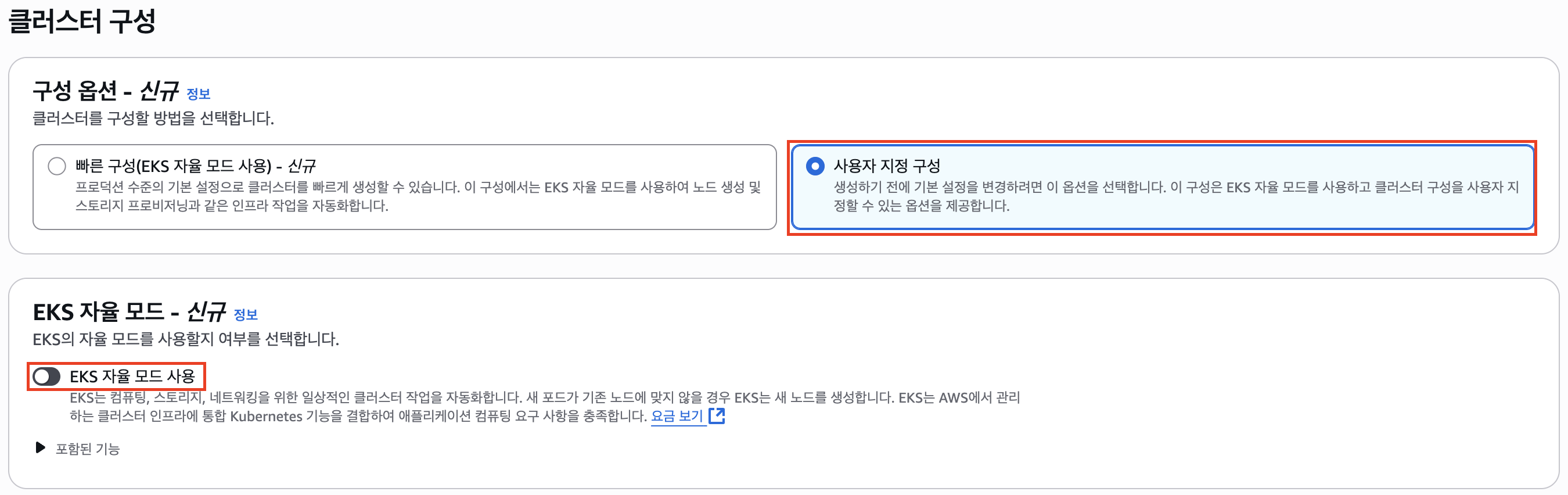 신규로 생성할 시, 빠른 구성으로 선택되어 있을 텐데 과금 요소가 포함되어 상당부분 포함되어 있기 때문에, 사용자 지정 구성으로 선택해준다. 추가로 자율 모드도 선택해제 해준다.