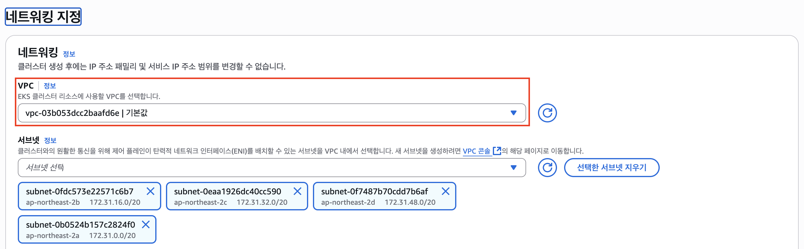 나는 기본 vpc를 지정했기 때문에 알아서 지정되었다.