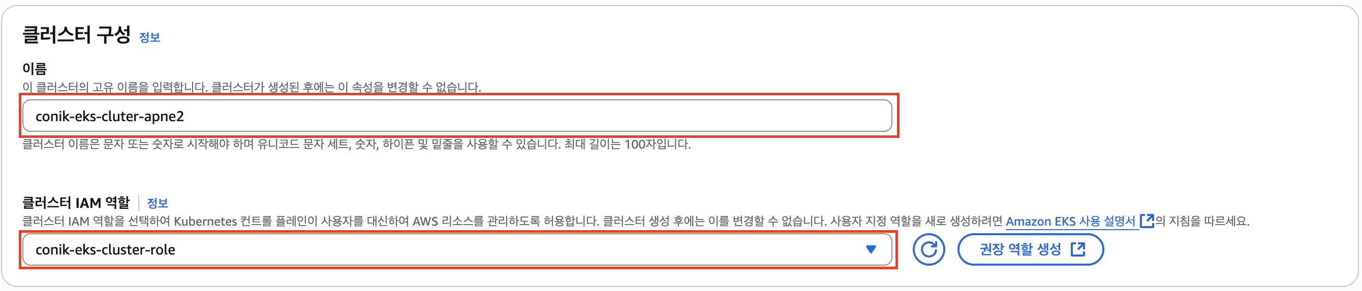 클러스터 구성에서 클러스터 이름으 정하고, 2번 항목에서 클러스터를 위해 만들어놓은 역할을 연결해준다. 이름은 명명 법칙을 정해야 리소스를 관리할 때 편하기 때문에, 나는 {applicationName}-{AwsServicePurpose}-{AZ} 로 명명해주었다. IAM ROLE을 미리 만들어두지 않았다면, 오른쪽의 권장 역할 생성을 통해 ROLE을 하나 생성하고, 새로고침해서 연결해주면 된다.